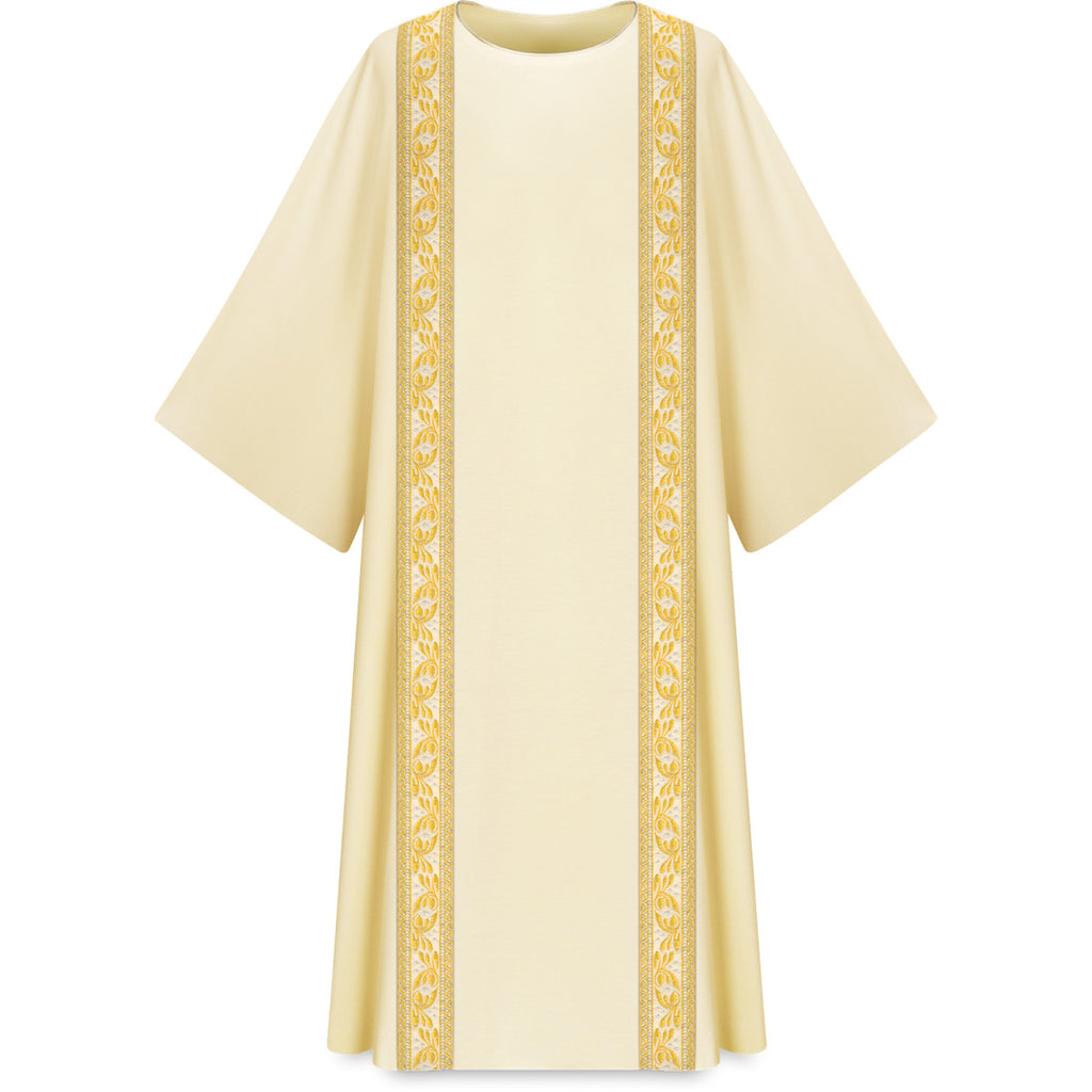 This beautiful Dalmatic from Slabbinck is created in Dupion Beige. The dalmatic is adorned with gold galoon down the front and back.. Standard width 59" (150 cm), length 53", inside deacon stole included. Plain neckline.